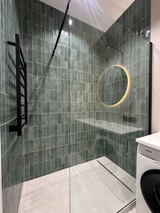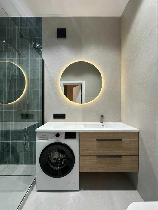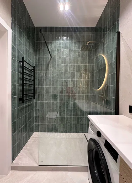 Санвузол з душем, є пральна машинка.